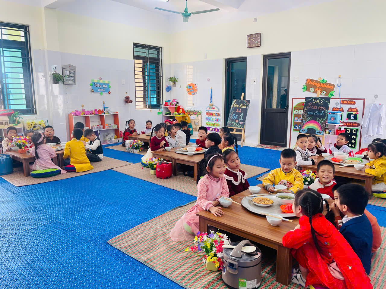 Tại lớp 5TA2, các cô giáo đã tổ chức bữa ăn theo phong cách gia đình, nơi các bé ngồi quây quần bên nhau quanh mâm cơm.