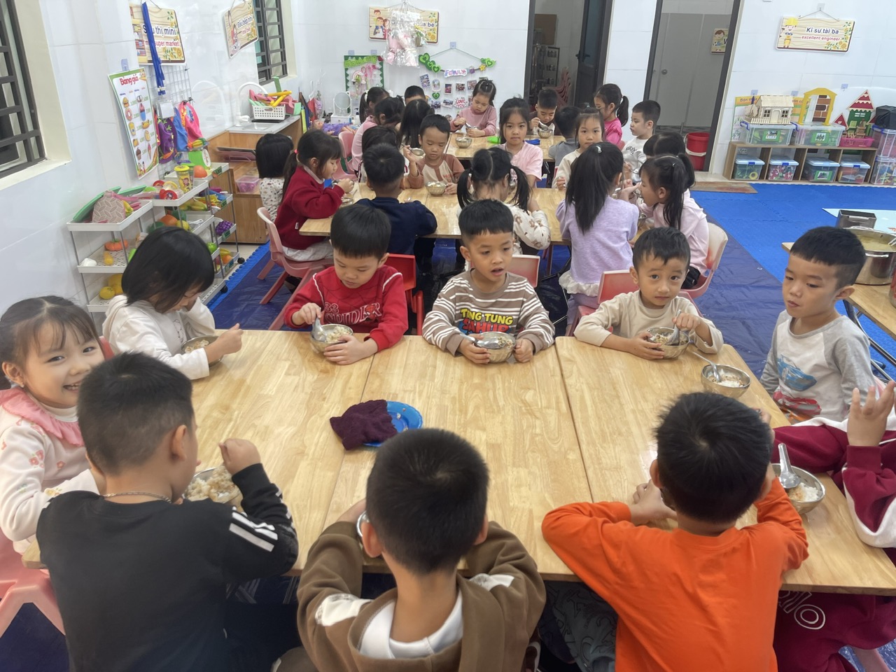 Ăn bán trú tại trường giúp trẻ được đảm bảo dinh dưỡng hợp lý, ăn đúng giờ và đủ chất. Trẻ hình thành thói quen ăn uống khoa học, rèn kỹ năng tự phục vụ, biết chia sẻ, hợp tác trong bữa ăn và phát triển thể chất toàn diện.