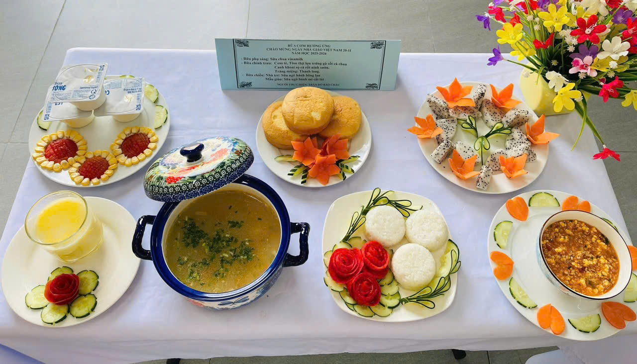 Trong không khí ấm áp chào mừng Ngày Nhà giáo Việt Nam 20-11, Trường Mầm non An Thọ đã long trọng tổ chức hoạt động "Bữa cơm hưởng ứng Ngày Nhà giáo Việt Nam 20-11, Năm học 2025-2026". Hoạt động này là lời khẳng định về chất lượng dinh dưỡng và sự chăm sóc toàn diện mà nhà trường dành cho các bé. Đặc biệt, mâm cơm mẫu do cô Trần Đỗ Bảo Châu và đội ngũ bếp ăn dày công chuẩn bị đã nhận được nhiều lời khen ngợi.