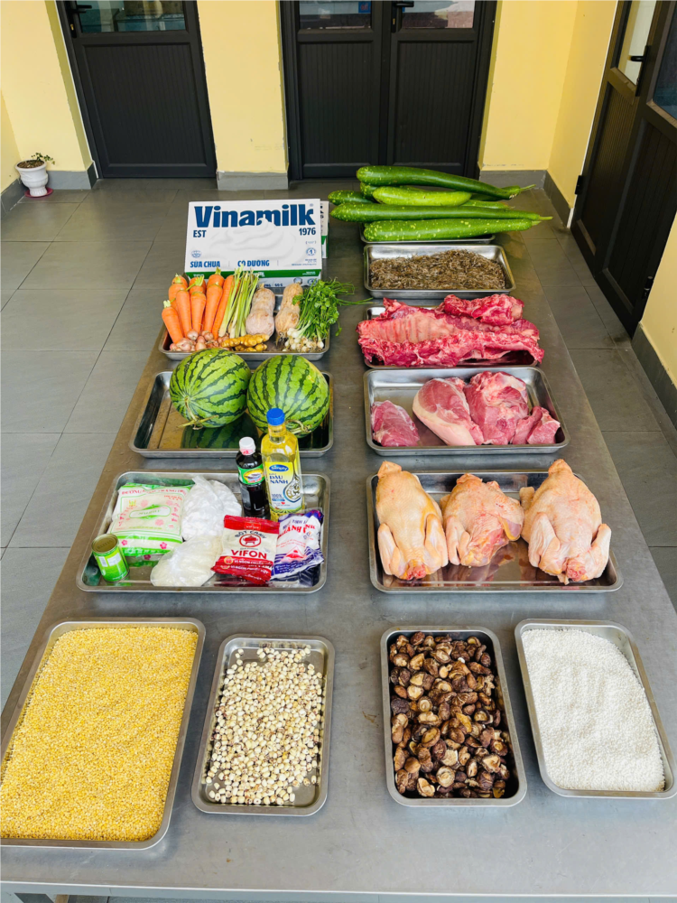 Ngay từ sáng sớm, công tác giao nhận thực phẩm đã được thực hiện nghiêm ngặt. Nhìn vào bàn nguyên liệu hôm nay, có thể thấy sự đa dạng và độ tươi mới tuyệt đối: