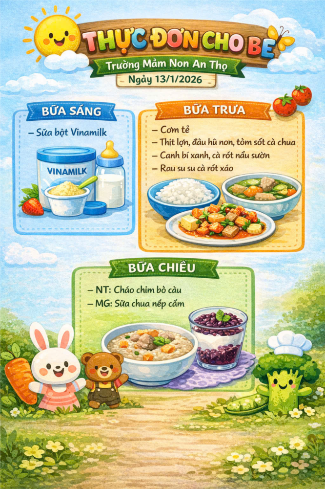 Tại Trường Mầm non An Thọ, mỗi bữa ăn không chỉ là cung cấp năng lượng mà còn là sự chăm sóc tận tâm về sức khỏe cho các bé. Ngày 13/01/2026 tiếp tục là một ngày tràn đầy dưỡng chất với những lựa chọn thực phẩm tươi ngon và an toàn nhất.