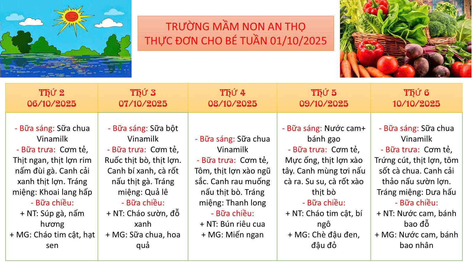 📌 Nhà trường trân trọng gửi tới quý phụ huynh thực đơn chi tiết tuần I tháng 10/2025 để cùng đồng hành trong việc chăm sóc dinh dưỡng và sức khỏe cho bé yêu.