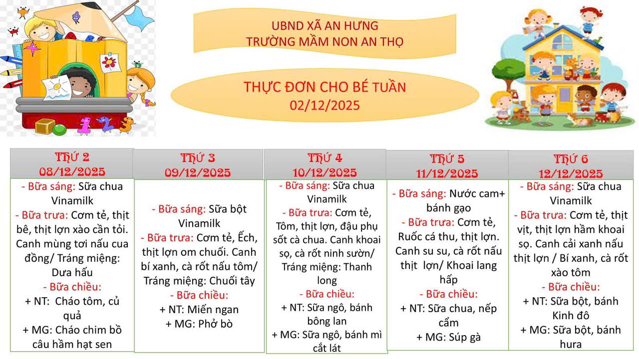🍎 Thực Đơn của trẻ Tuần 2/12/2025: Đảm Bảo Dinh Dưỡng Toàn Diện Cho Bé Yêu Trường Mầm Non An Thọ 🥕