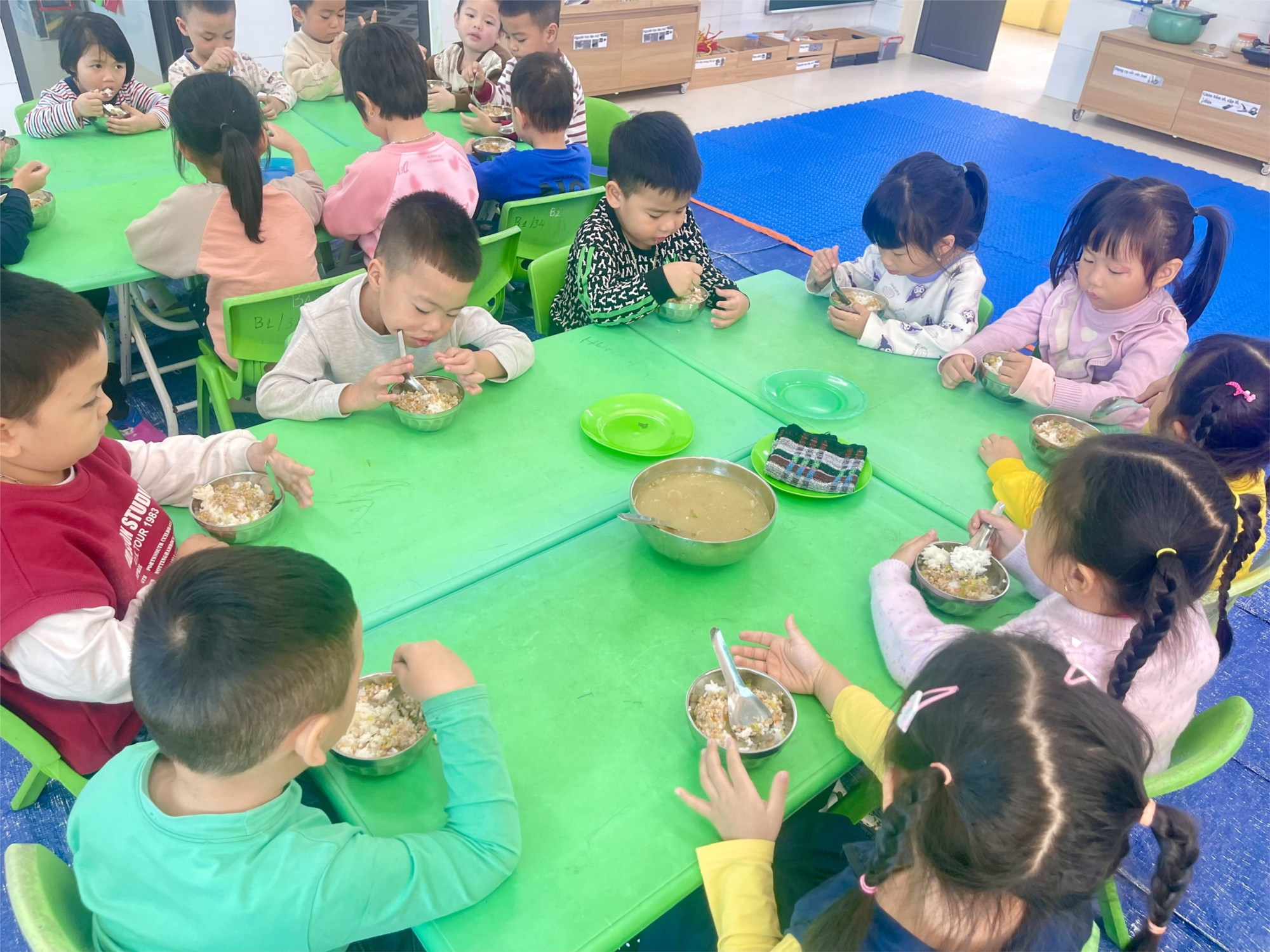 Ngoài ra, ăn trưa tại trường còn giúp trẻ hình thành thói quen ăn uống lành mạnh, biết tự phục vụ, rèn kỹ năng ngồi ăn đúng cách và phối hợp cùng bạn bè. Trẻ cũng duy trì được nề nếp sinh hoạt điều độ, tạo điều kiện cho buổi học chiều đạt hiệu quả hơn.
