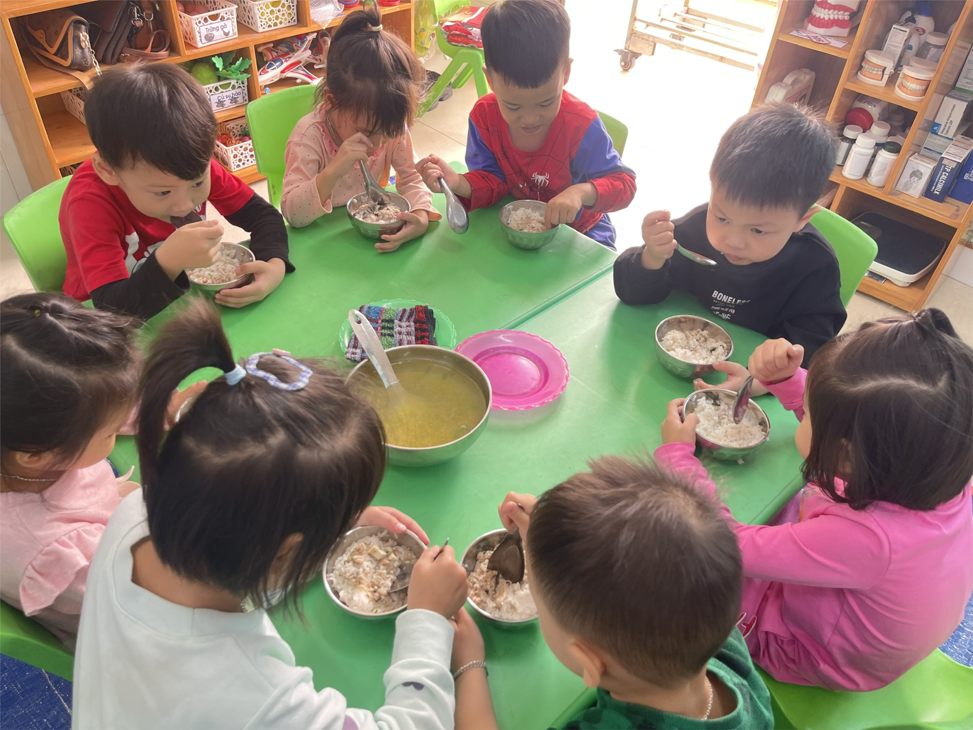Các bữa ăn tại trường được xây dựng theo thực đơn khoa học, đảm bảo cân đối các nhóm chất: đạm, béo, tinh bột, vitamin và khoáng chất. Trẻ được tập thói quen ăn uống lành mạnh, biết tự xúc ăn, ngồi đúng tư thế và giữ vệ sinh khi ăn.
