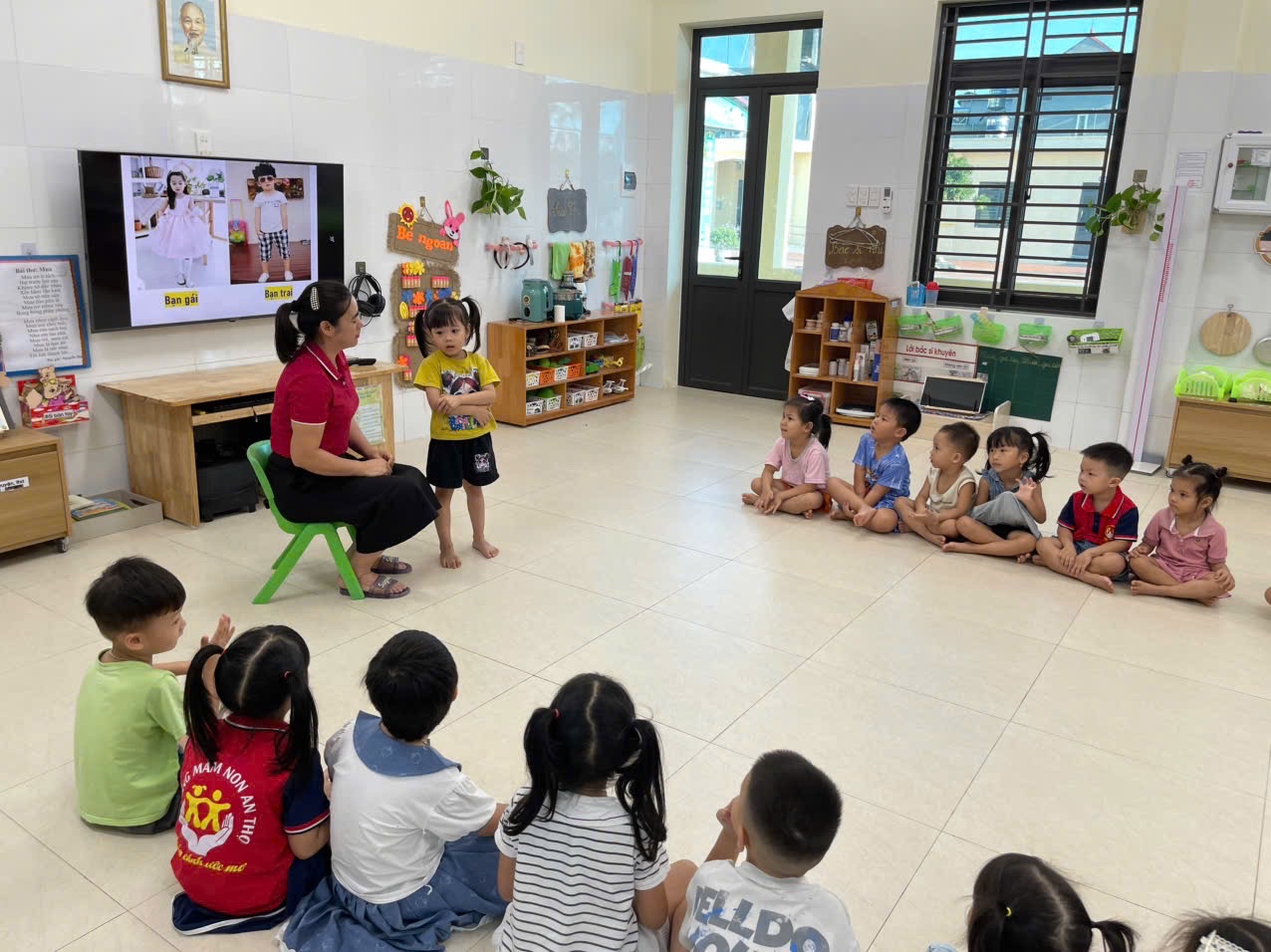 Trong giờ học phát triển tình cảm – kỹ năng xã hội: “Tìm hiểu về họ, tên, tuổi, giới tính, đặc điểm và sở thích của bản thân và bạn” trẻ được tham gia các hoạt động trò chuyện, quan sát, chơi trò “Làm quen cùng bạn” để nhận biết và giới thiệu về bản thân: họ tên, tuổi, giới tính, đặc điểm riêng như tóc, mắt, chiều cao, trang phục… Trẻ còn được chia sẻ về sở thích như chơi đồ chơi, hát, vẽ hay đọc truyện. Qua hoạt động, trẻ học cách tự tin nói về mình, lắng nghe bạn, biết tôn trọng sự khác biệt và hợp tác trong giao tiếp. Giờ học giúp trẻ hình thành kỹ năng xã hội cơ bản, phát triển tình cảm tích cực, yêu quý bản thân và gắn bó thân thiện với bạn bè, cô giáo.