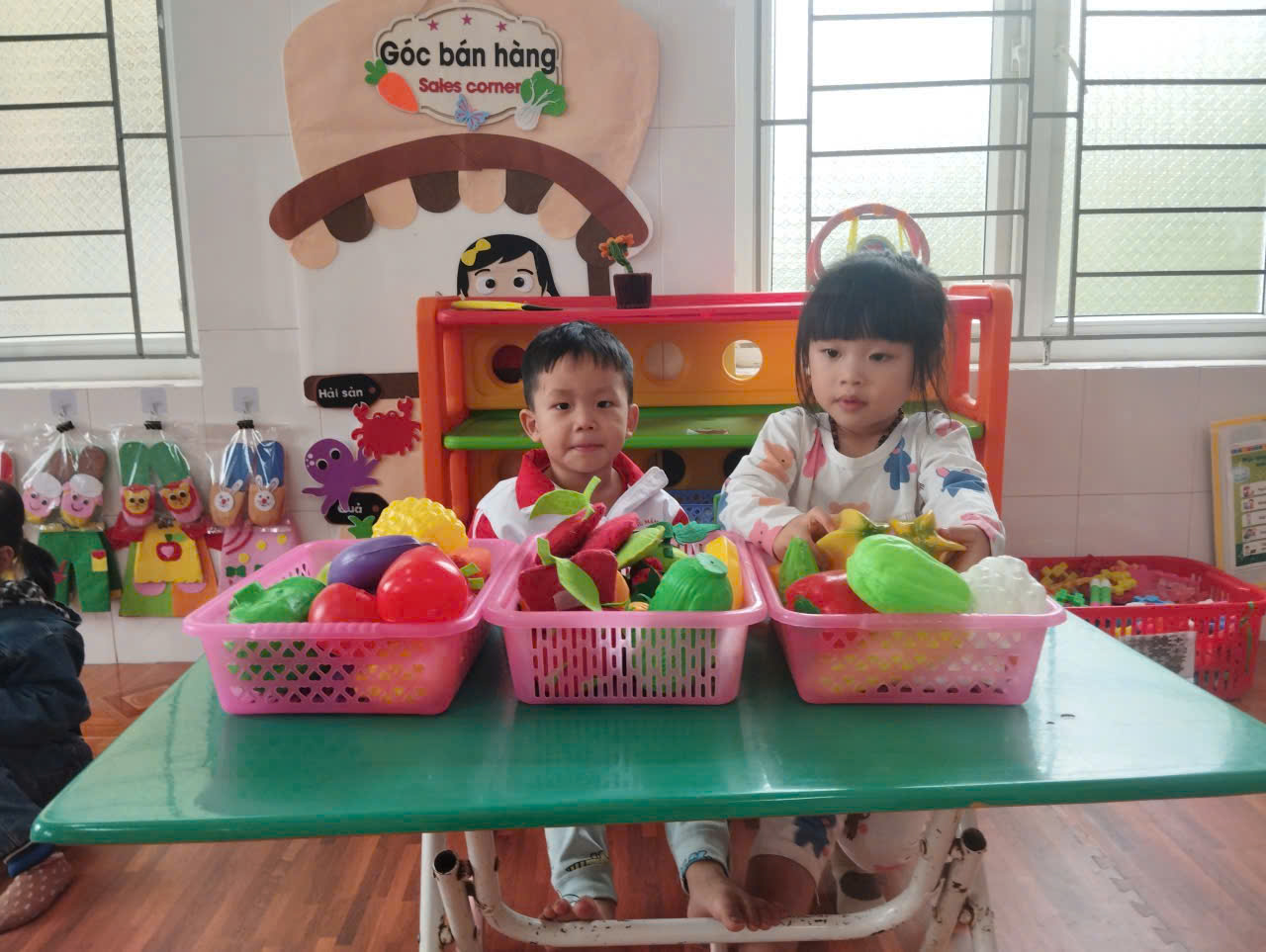 Trong góc bán hàng có thể trải nghiệm làm người bán hàng. Với những nhiều mawtj hàng khác nhau theo chủ đề. Trẻ đã dùng ngôn ngữ và những kiến thức cô đã dạy để giới thiệu với khách hàng.