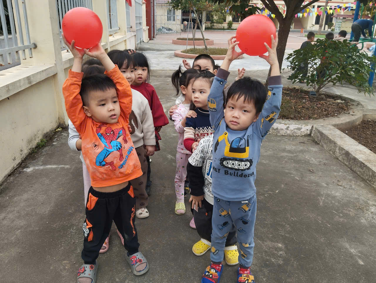 Các bé lớp 3TC1 tham gia trò chơi Chuyền bóng qua đầu