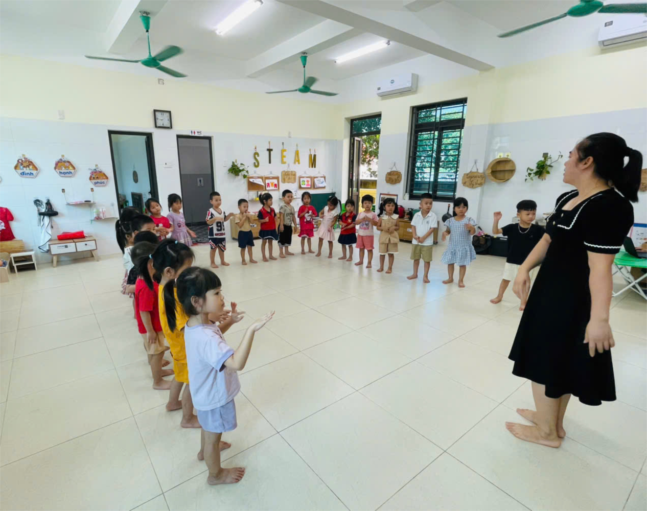 Giờ học ca hát có tác dụng giúp trẻ 4–5 tuổi phát triển toàn diện cả về ngôn ngữ, thẩm mỹ và cảm xúc. Thông qua các bài hát vui tươi, gần gũi, trẻ rèn luyện khả năng nghe, phát âm rõ ràng, biết thể hiện cảm xúc qua giọng hát và cử chỉ. Hoạt động ca hát còn giúp trẻ mạnh dạn, tự tin trước đám đông, phát triển trí nhớ, khả năng tập trung và cảm thụ âm nhạc. Đồng thời, trẻ học cách phối hợp, chia sẻ niềm vui cùng bạn bè, hình thành tình yêu nghệ thuật và nuôi dưỡng tâm hồn trong sáng, vui tươi.