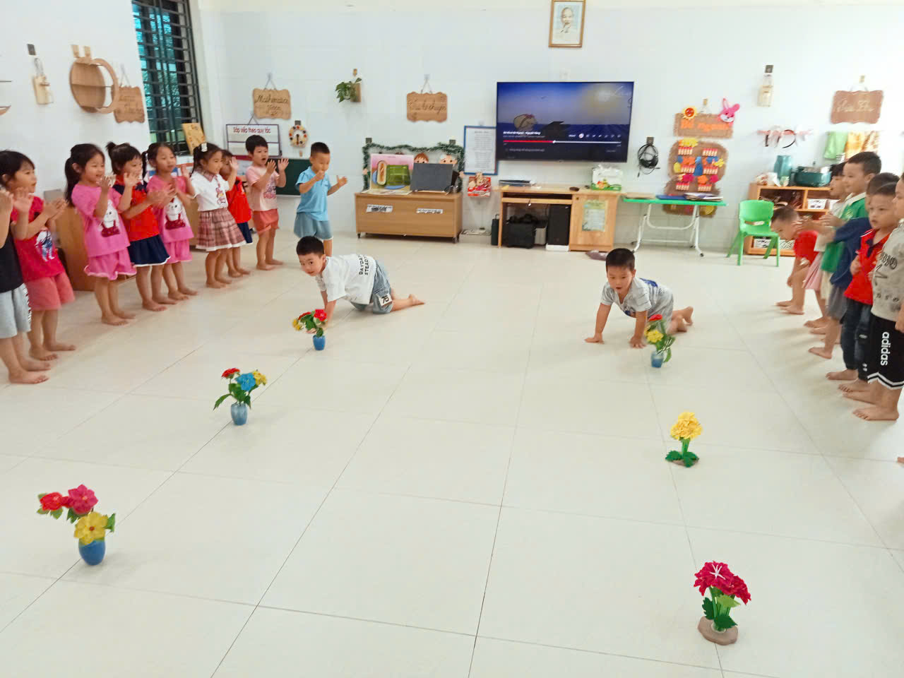 Giờ thể dục còn mang lại cho trẻ niềm vui vận động, giúp các con giải tỏa năng lượng, hứng khởi cho ngày học tập mới. Nhiều bé nhút nhát ban đầu còn e dè, nhưng dần dần, qua từng trò chơi vận động, các con mạnh dạn hơn và biết thể hiện bản thân.