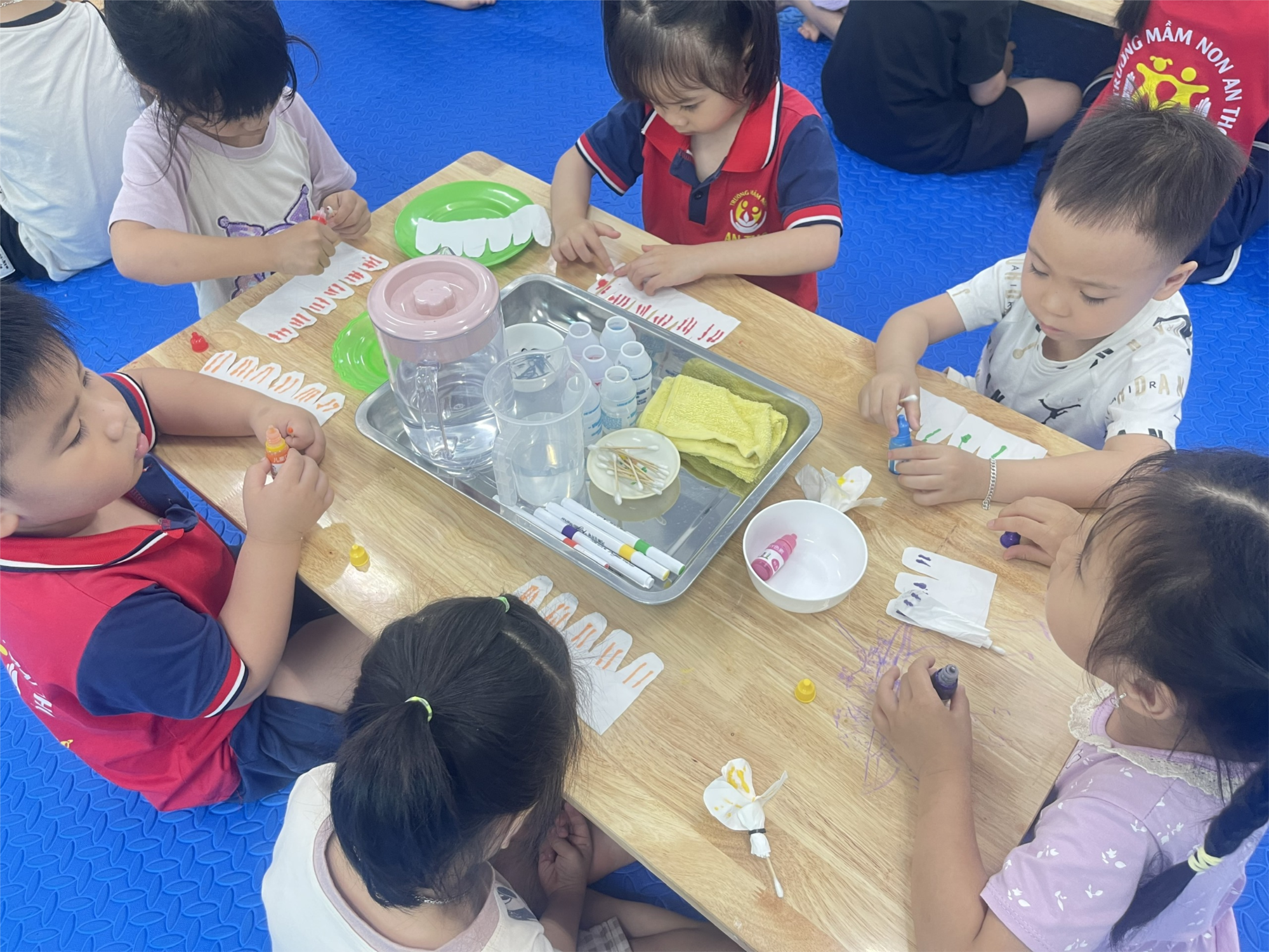 Thông qua hoạt động này, trẻ được rèn luyện tư duy, biết đặt câu hỏi như: vì sao hoa lại nở, điều gì làm cánh hoa mở ra. Giáo viên từ đó gợi mở để trẻ hiểu bước đầu về sự thấm nước của giấy. Bên cạnh đó, các bé còn được thực hành thao tác như gấp, thả hoa vào nước, giúp phát triển sự khéo léo và phối hợp tay – mắt.
