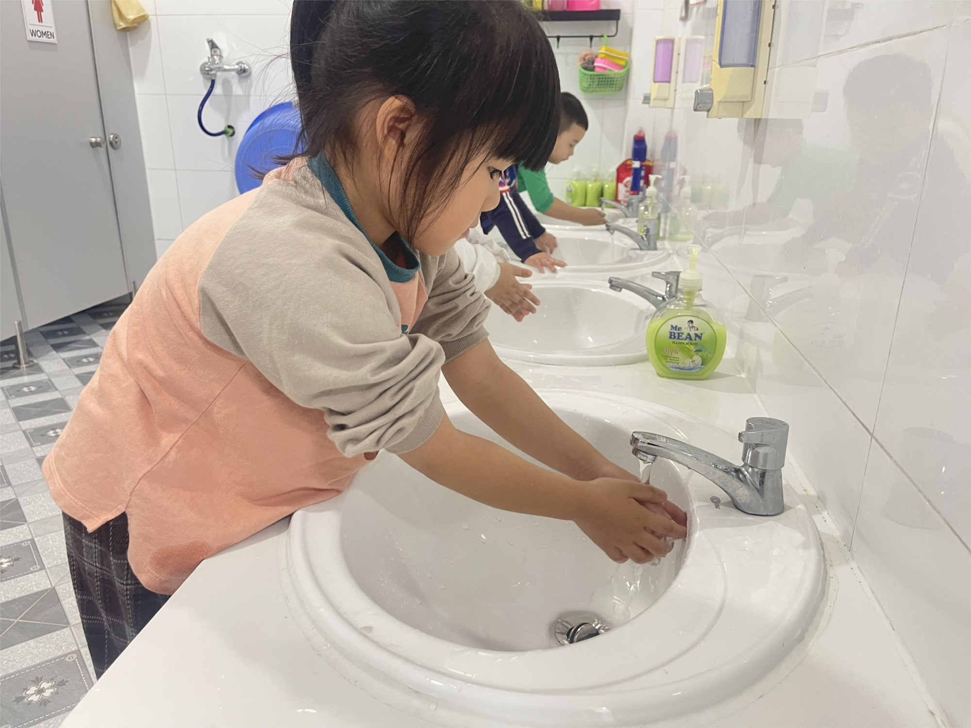 Trẻ học cách tự mở vòi nước, lấy xà phòng, chà tay đúng quy trình – giúp trẻ tự lập hơn.