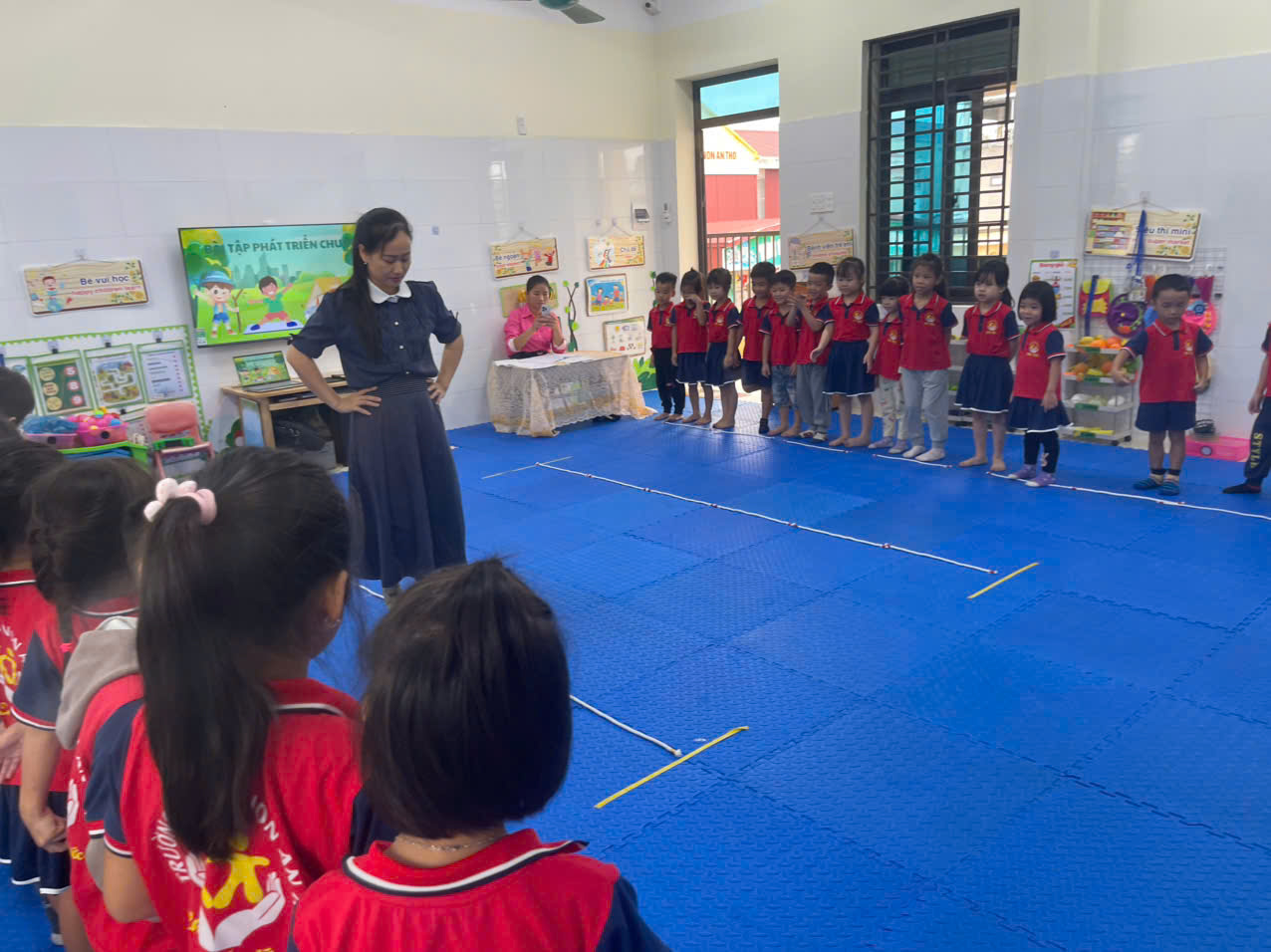 Thể dục sáng thường xuyên giúp trẻ tập hít thở sâu, điều hòa được nhịp thở, tăng cường quá trình trao đổi chất và tuần hoàn trong cơ thể, giúp các khớp dây chằng được mềm dẻo, linh hoạt, đồng thời hỗ trợ cho những hoạt động trong ngày của trẻ thêm nhịp nhàng, nhanh nhẹn và tạo cho trẻ tâm trạng sảng khoái, vui tươi đón chào họat động mới. Qua hoạt động thể dục buổi sáng giáo dục trẻ sự chú ý, tính kiên định, có khả năng nâng cao về trí lực, làm nảy nở hứng thú và tình cảm.Các bé lớp 5TA1 với giờ thể dục kĩ năng đi trên dây đặt trên sàn