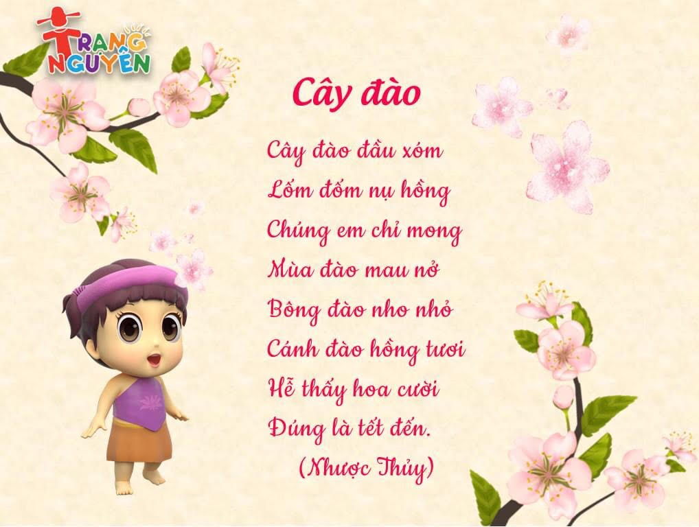 Bài thơ "Cây đào" của tác giả Nhược Thủy là tác phẩm thiếu nhi phổ biến, miêu tả hình ảnh cây đào đầu xuân với nụ hồng lốm đốm và hoa đào nho nhỏ, thắm sắc. Bài thơ thể hiện sự háo hức mong chờ của các em nhỏ khi Tết đến, hoa đào nở rộ, mang lại không khí vui tươiấm áp và may mắn