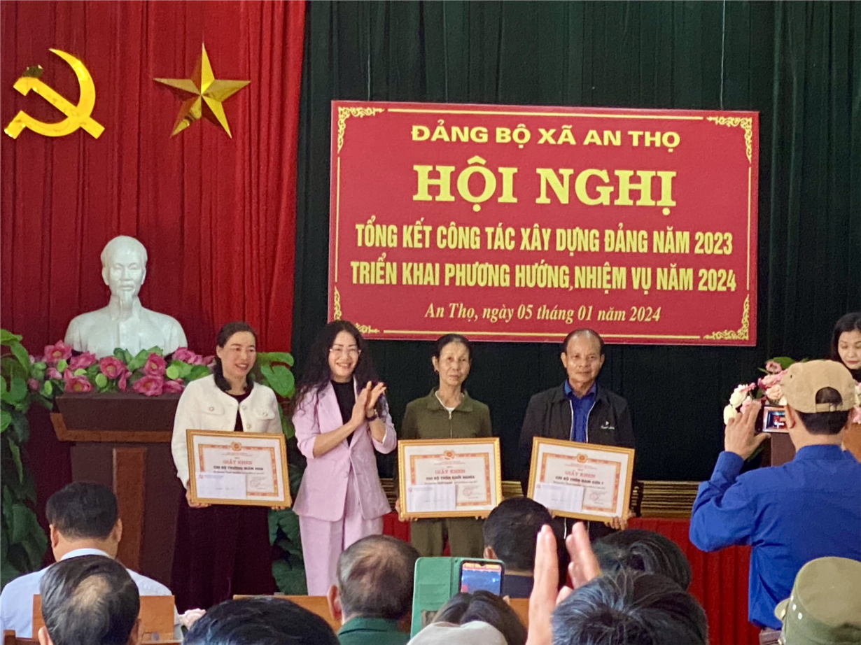 Ngày 5 tháng 1 năm 2024 tại hội nghị tổng kết công tác xây dựng Đảng năm 2023, triển khai phương hướng nhiệm vụ năm 2024 của Đảng bộ xã An Thọ. Tới dự và chỉ đạo có đồng chí Phạm Thị Hoa- Huyện ủy viên, chủ nhiệm ủy ban kiểm tra Đảng. Chi bộ trường Mầm non được Đảng Bộ tặng giấy khen chi bộ hoàn thành xuất sắc nhiệm vụ, đây là sự cố gắng, nỗ lực thực hiện các nhiệm vụ của cấp ủy, BGH và tập thể cán bộ giáo viên, nhân viên nhà trường. Có 5 Đảng viên là giáo viên hoàn thành xuất sắc nhiệm vụ năm 2023. Sau đây là một số hình ảnh: