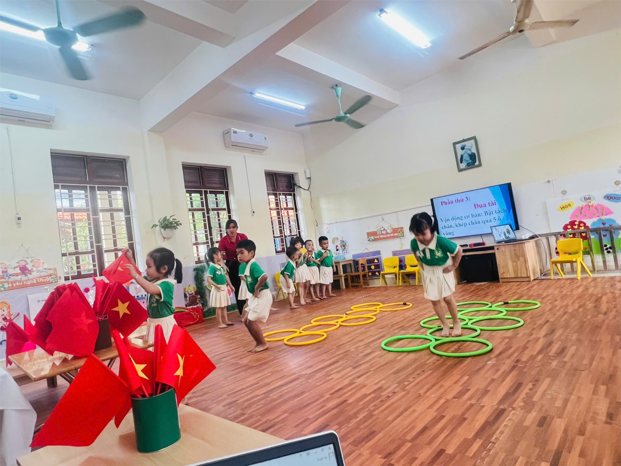 Hoạt động thể chất “ Bật tách chân khép chân qua 5 ô vòng”
