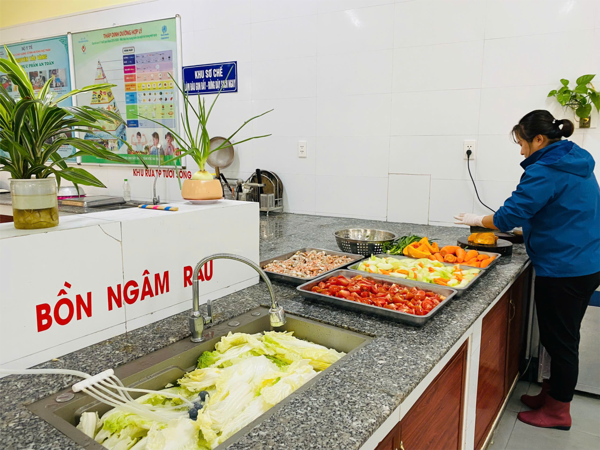 Máy xục khí ozon ngâm rau trước khi thái.