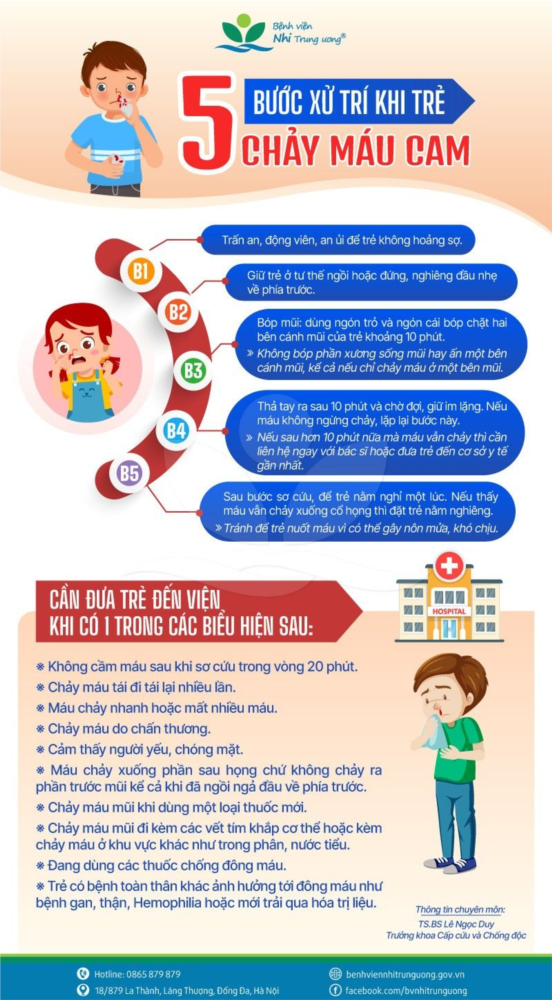Khi trẻ bị chảy máu cam, phụ huynh cần bình tĩnh và thực hiện ngay các bước sau: