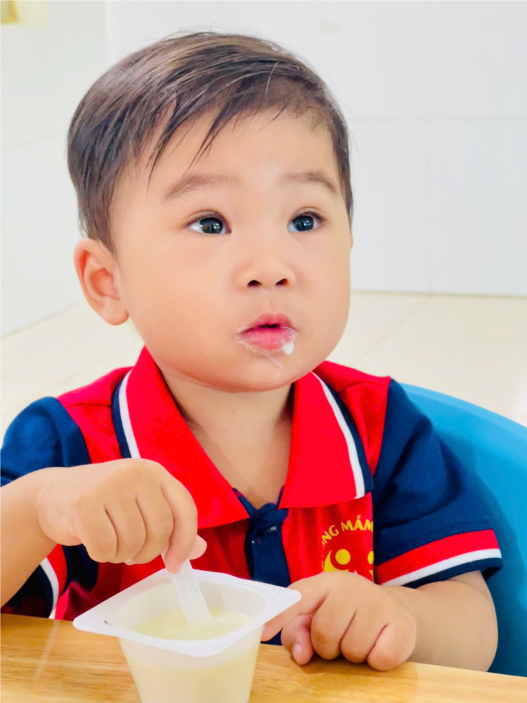sữa chua Vinamilk mát lạnh, thơm ngon. Những hũ sữa chua trắng ngần, ngọt dịu được các cô chuẩn bị chu đáo không chỉ mang đến nguồn dinh dưỡng thiết yếu giúp trẻ tiêu hóa tốt, ăn ngon miệng hơn mà còn bổ sung năng lượng cho một ngày học tập, vui chơi sôi nổi. Bé nào cũng háo hức, ngồi ngay ngắn, tự tay mở nắp hộp và thưởng thức từng thìa sữa chua ngon lành với gương mặt rạng rỡ. Qua bữa ăn phụ sáng, các con không chỉ khỏe mạnh, vui vẻ mà còn học được thói quen ăn uống văn minh, biết giữ vệ sinh và chia sẻ niềm vui cùng bạn bè.