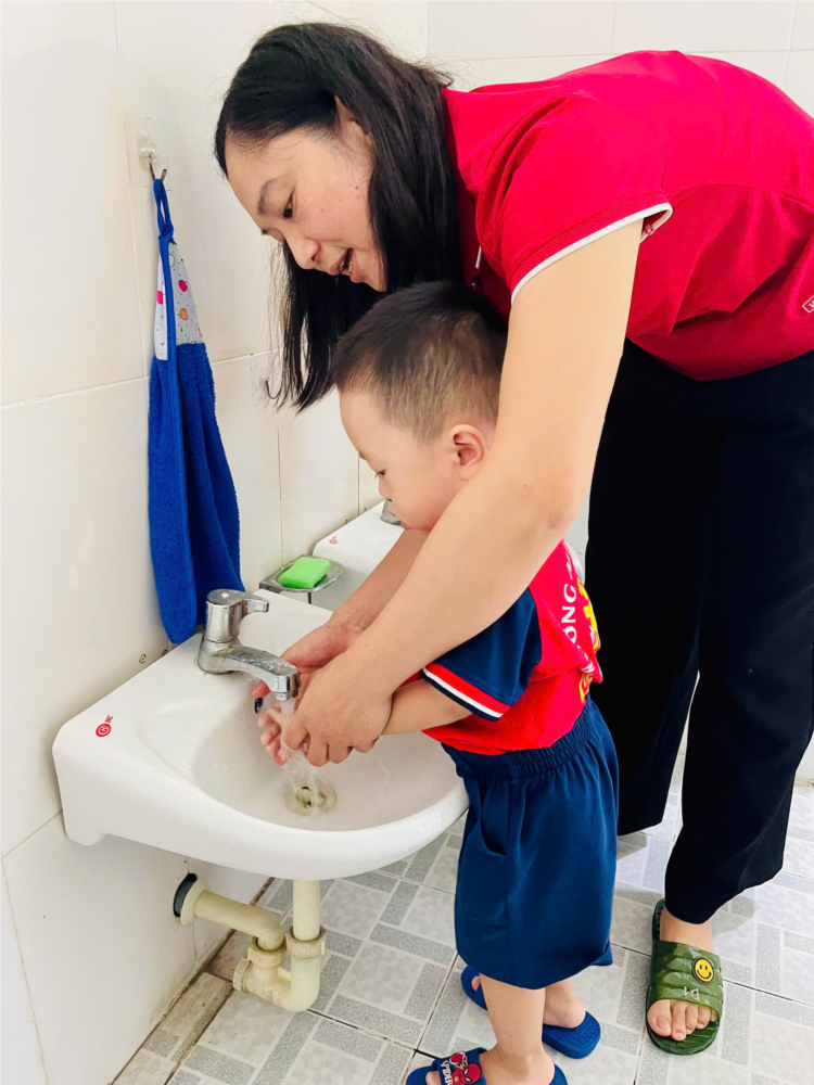 Rửa tay là một thói quen nhỏ nhưng mang lại lợi ích thật lớn cho sức khỏe của các bé. Tại lớp Nhà trẻ D2, Trường Mầm non An Thọ, hoạt động “Bé với vệ sinh rửa tay” được các cô giáo tổ chức thường xuyên, giúp các con hình thành ý thức giữ gìn vệ sinh ngay từ những năm đầu đời. Dưới sự hướng dẫn ân cần, bé học cách mở vòi nước, làm ướt tay, xoa xà phòng, chà sạch từng ngón và rửa lại bằng nước sạch, sau đó lau khô bằng khăn riêng. Những động tác tuy đơn giản nhưng rèn cho trẻ sự gọn gàng, ngăn nắp, đồng thời ngăn ngừa nhiều bệnh lây qua đường tiếp xúc. Đây là một hoạt động nhỏ bé nhưng vô cùng ý nghĩa, góp phần giáo dục trẻ biết yêu quý bản thân, giữ gìn sức khỏe và sống lành mạnh mỗi ngày.