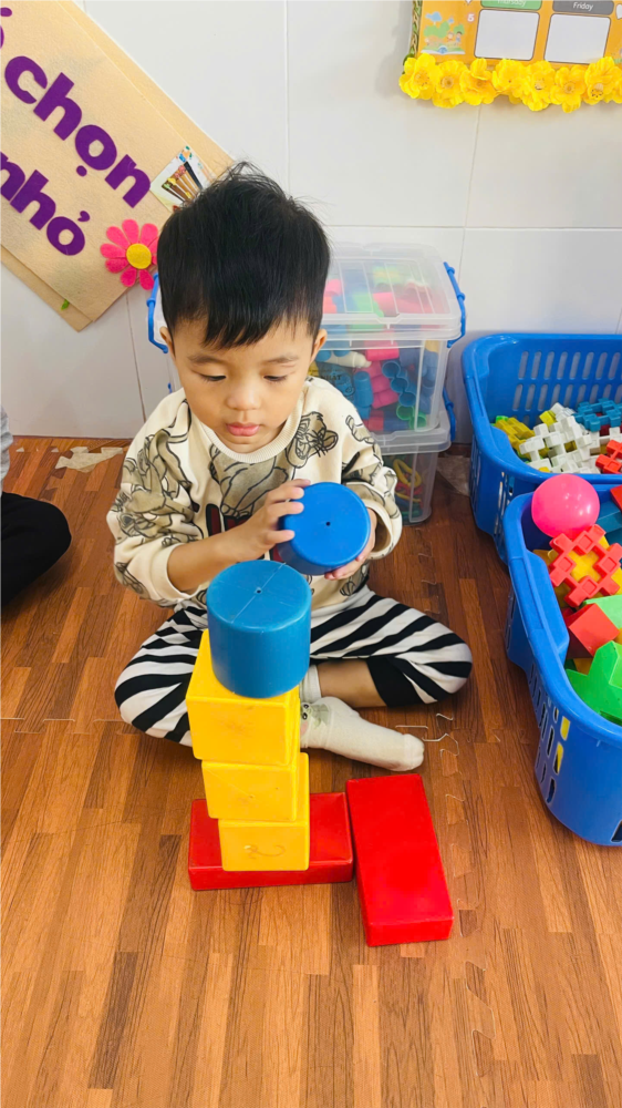 Trò chơi “Xếp chồng” là hoạt động vui học dành cho trẻ trẻ 24–36 tháng, giúp trẻ phát triển tư vấn, sự khéo léo và khả năng phối hợp tay – mắt. Với các loại khối hình, hộp có kích thước khác nhau, trẻ sẽ được trải nghiệm công việc lựa chọn, đặt chồng và thăng bằng các vật lên nhau. Đây là giai đoạn trẻ rất thích khám phá, vì vậy trò chơi mang đến cơ hội để trẻ thử nghiệm, quan sát và điều chỉnh hành động