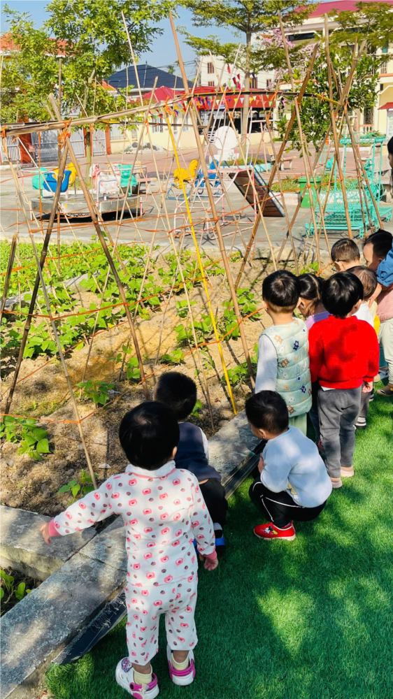 Trong không gian vườn rau xanh mát của trường 🌱, các bé lớp NTD2 đã cùng cô giáo tham gia hoạt động quan sát và trò chuyện về luống rau – cây đỗ đũa với sự hào hứng và thích thú 😊. Trước luống rau xanh tốt 🌿, các bé được cô giới thiệu tên gọi của cây đỗ đũa, đặc điểm nổi bật như thân leo, lá xanh 🍃 và những quả đỗ dài, thon 🌾 đang lớn dần từng ngày.