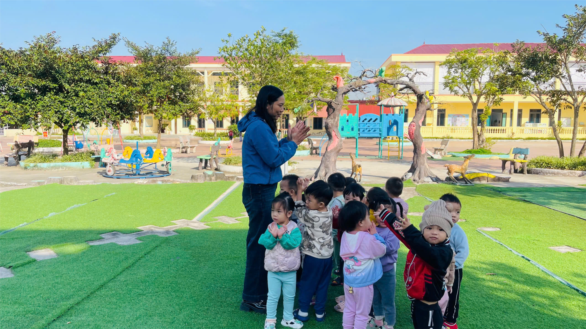 Cô giáo sử dụng những câu hỏi đơn giản, dễ hiểu 🎤 như “Hôm nay trời thế nào?”, “Trời nắng hay mưa?” để khuyến khích các bé mạnh dạn trả lời và bày tỏ cảm nhận của mình 👶💬. Nhiều bé còn chỉ tay lên trời 👆, gọi tên thời tiết bằng những từ ngữ ngắn gọn, đáng yêu 🥰, tạo nên không khí lớp học thật sinh động và ấm áp.