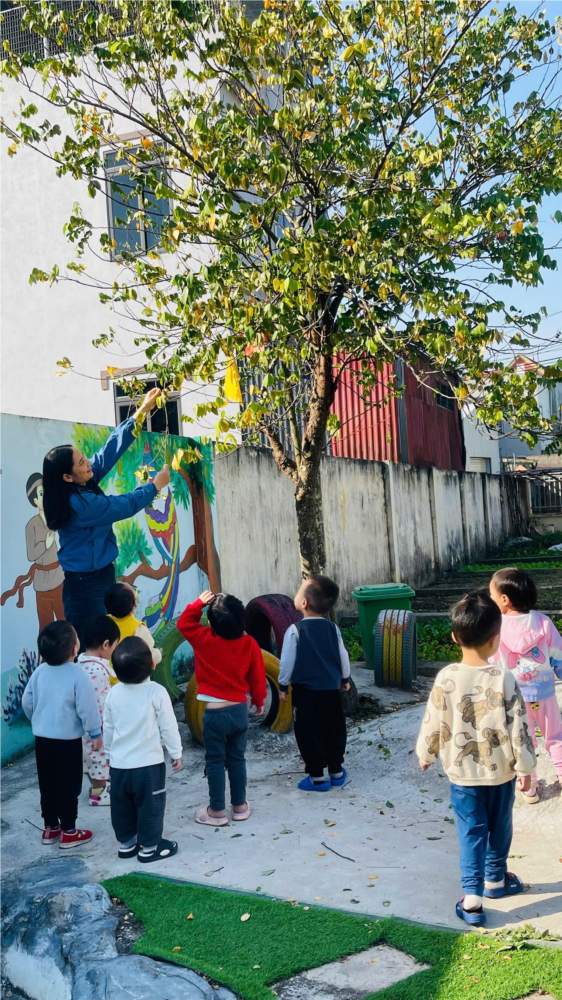 Các bé chăm chú quan sát 👀, nhẹ nhàng sờ vào thân cây ✋, ngắm nhìn những chiếc lá nhỏ xinh 🍀 và lắng nghe cô trò chuyện bằng những câu hỏi gần gũi, dễ hiểu 🎵. Hoạt động diễn ra trong không khí vui vẻ, nhẹ nhàng, giúp trẻ cảm nhận được vẻ đẹp của thiên nhiên xung quanh 🌈.