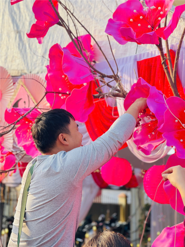 Trong hình ảnh, phụ huynh đang tỉ mỉ treo từng bông hoa xuân 🌺, chỉnh lại từng dây trang trí 🎀 để không gian thêm nổi bật và ấm áp. Những bàn tay khéo léo ấy đã góp phần tạo nên một góc xuân thật lung linh cho các con vui chơi và trải nghiệm 🎊✨