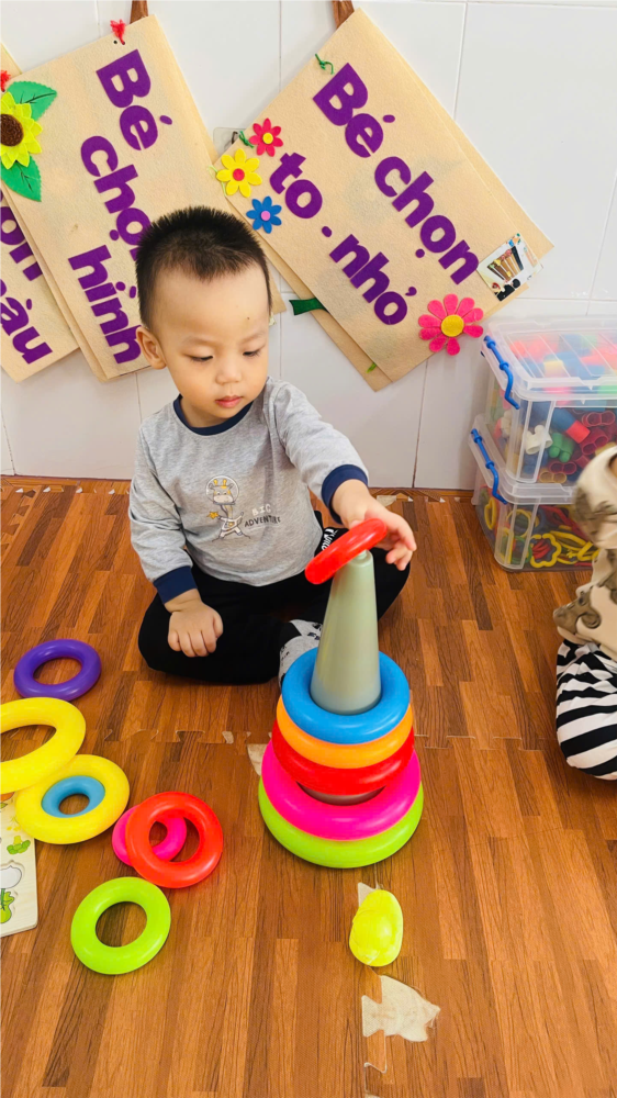 Trò chơi “Tháp vòng” là một trong những hoạt động phát triển Góc quan – vận động rất phù hợp cho trẻ 24–36 tháng tại lớp NTD2, Trường Mầm non An Thọ. Với những vòng tròn nhiều màu sắc và kích thước khác nhau, trẻ được khuyến khích lựa chọn, phân biệt và kết hợp các vòng tròn theo thứ tự từ lớn đến nhỏ. Đây là giai đoạn trẻ bắt đầu hình thành khả năng tư duy logic đơn giản, vì vậy trò chơi giúp trẻ rèn luyện quan sát, tập trung và khả năng phối hợp tay