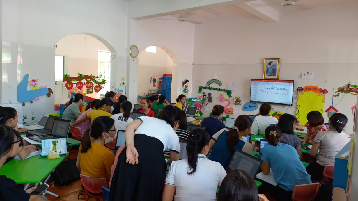 Thực hiện Kế hoạch số 333/KH-PGDĐT ngày 15/9/2023 về việc triển khai thực hiện giải pháp sáng tạo cấp huyện năm học 2023- 2024. Trường Mầm non An Thọ đã tiến hành rà soát cơ sở hạ tầng thông tin từ đầu năm học và xây dựng kế hoạch mua sắm trang thiết bị phục vụ thực hiện giải pháp: Đầu tư mua sắm 12 bộ bàn máy vi tính, 12 bộ tai nghe,12/12 lớp đã trang bị máy tính, màn hình ti vi, hệ thống mạng internet, lắp đặt hệ thống camera các nhóm lớp và các khu vực trong nhà trường...Chuyên môn đã bồi dưỡng CNTT trong việc sử dụng tiện ích của Excel, lưu trữ dữ liệu trên Driver, thiết lập kho học liệu điện tử, lập kế hoạch giáo dục và soạn duyệt giáo án trên Google classroom, quản lý hồ sơ theo cây thư mục, ứng dụng phần mềm Google form, hội họp trực tuyến, xây dựng chuyên đề trẻ được làm quen thao tác trên máy tính. Ứng dụng trong công tác truyền thông, nhà trường xây dựng các trang Website,panpage, Zalo để tuyên truyền về các hoạt động của nhà trường tới cộng đồng.